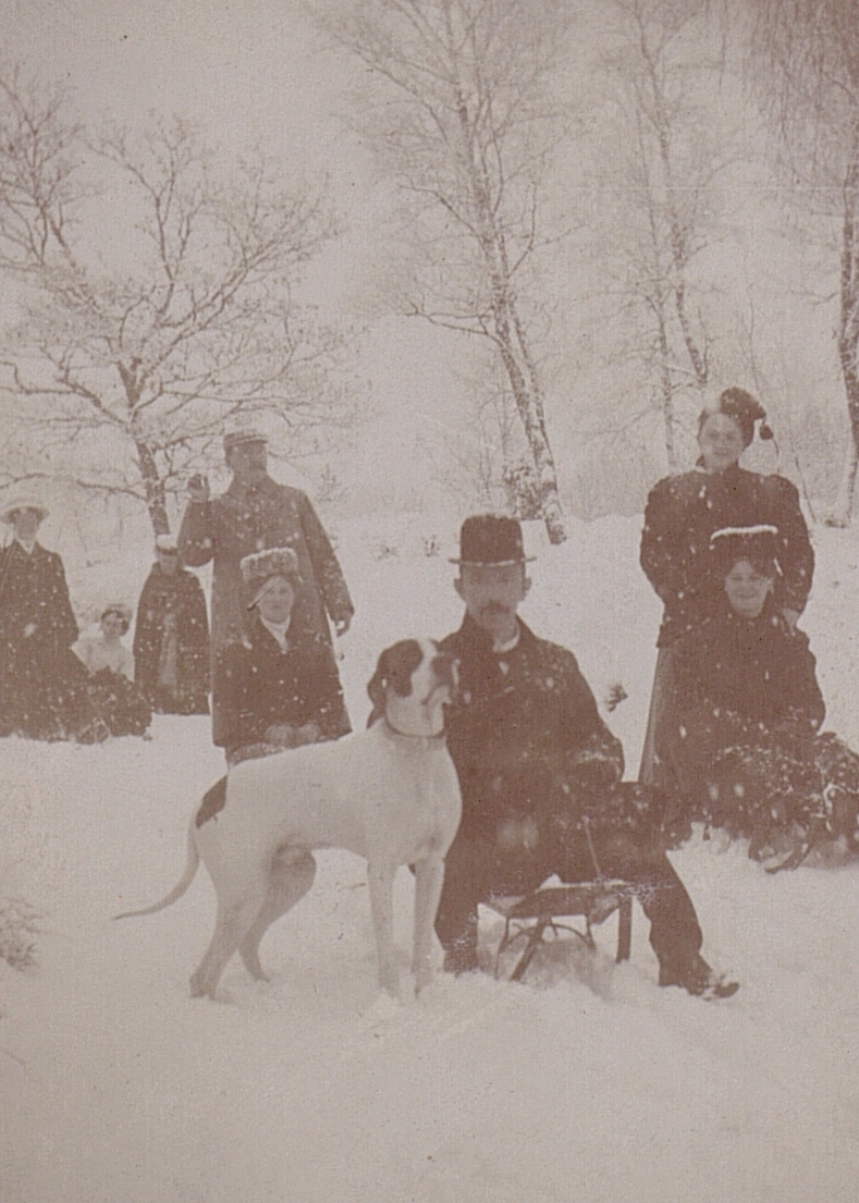Vinterbild från Sundsholms sanatorium 1910. Tk Berg med hunden Riquet.