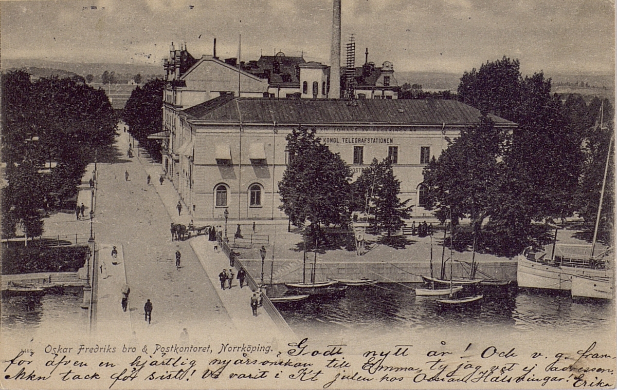 Vykort. Norrköping. Oskar Fredriks bro, postkontoret och telegrafstationen.