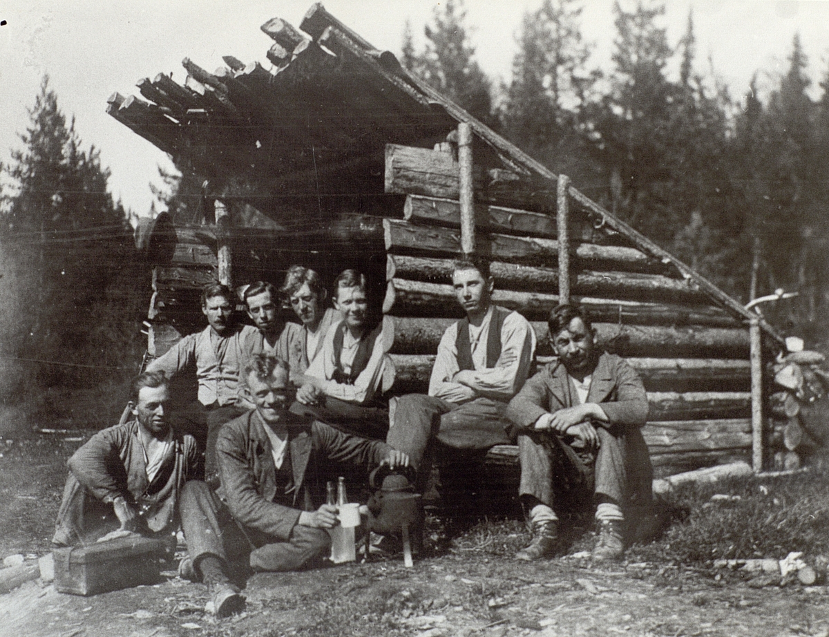 Linjelag som byggde telefinlinjen från Enskogen Till Tevansjö 1924. Man vilade middag vid denna flottkoja, som var byggd i form av ett gapskjul. Männen i främre raden från vänster Anders Berglöf, Helmer Hallenius, Olle Blomgren och Johan Thorell. I kojöppningen Olle Djäkner, Manne Haglund, Järvström och Englund. Linjegubbarna boode inhysta i bygdens gårdar, men till helgerna cyklade man hem, en sträcka på omkring 4 mil.