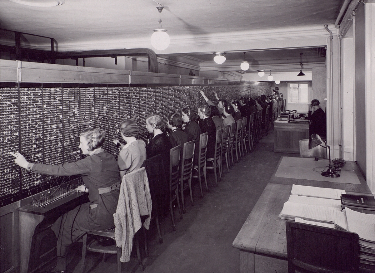 Interiör från förutvarande namnanropsstationen Slottsbacken 8, Stockholm. (Nedre apparatsalen) Växelbordslänga om 10 bord med vardera 3 expeditionsplatser.