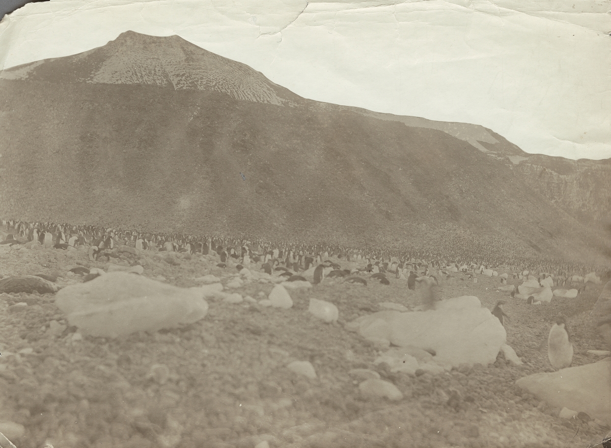 Fotografi från första svenska Antarktisexpeditionen 1901-1904. Motiv av pingvinkoloni nedanför berg.