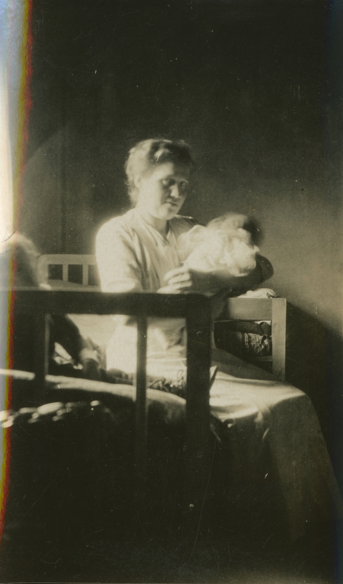 Fotografi från expedition till Spetsbergen. Motiv av kvinna som sitter i säng och håller i ett spädbarn.