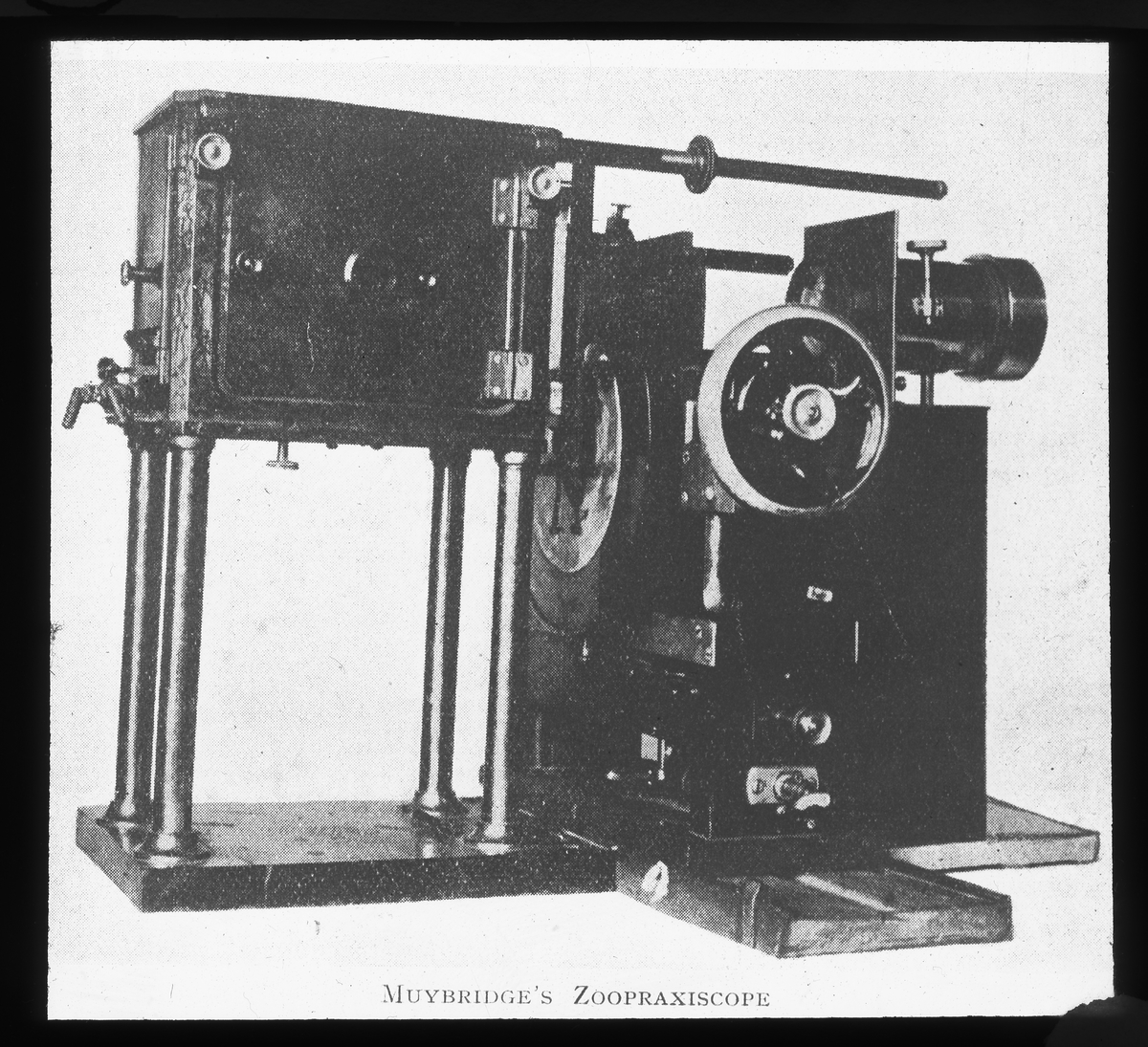 Muybridges zoopraxiskop. En självkonstruerad apparat för projektion av diapositiva bildserier.