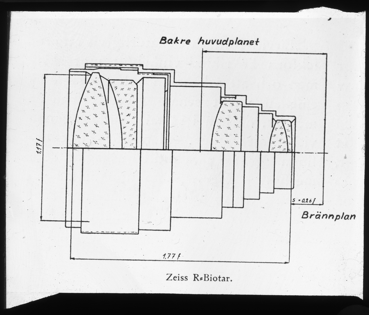 [Samma bild som SKC6325] Zeiss R-Biotar med den enorma öppningen F:0,85 (stor bländaröppning). Observera brännplanets läge strax bakom den sista linsen. Objektivet används för röntgenfilmning.