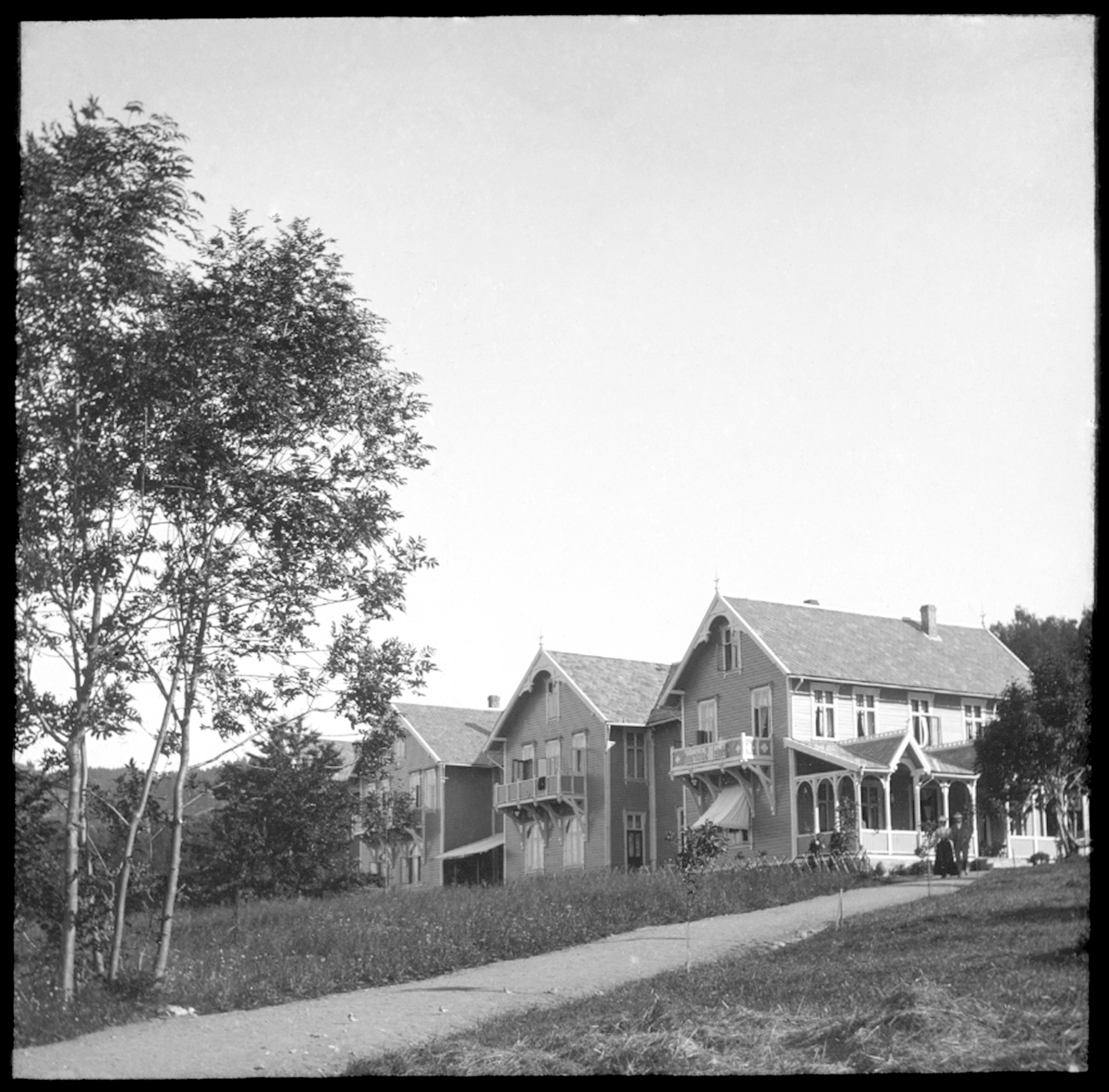 Skioptikonbild från institutionen för fotografi vid Kungliga Tekniska Högskolan. Motiv föreställande villor på rad. Bilden är troligen tagen av John Hertzberg under en resa i Sverige.
