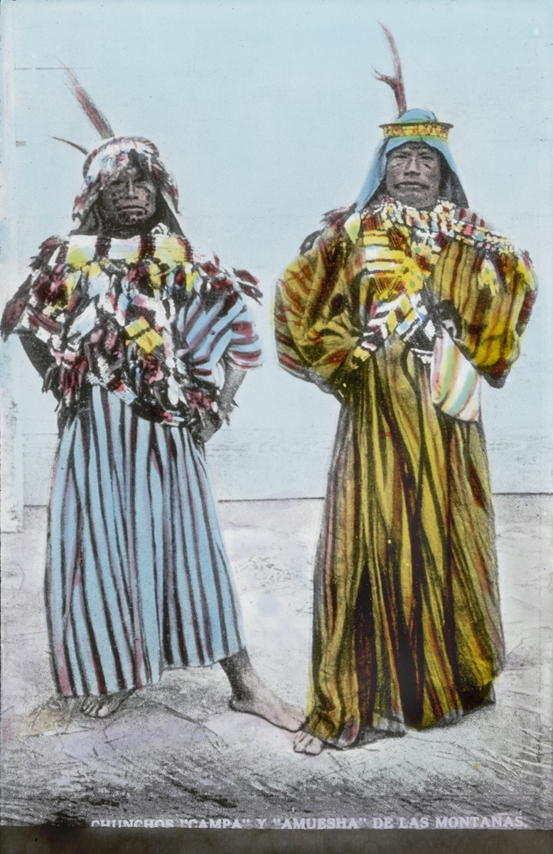 Kolorerad ljusbild, porträtt av urbefolkning, troligen Sydamerika.