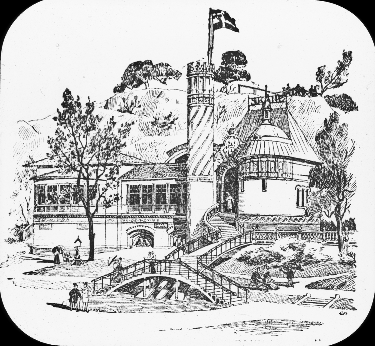 Skioptikonbild med motiv av Stockholmsutställningen 1897. Skånska storindustriens paviljong.