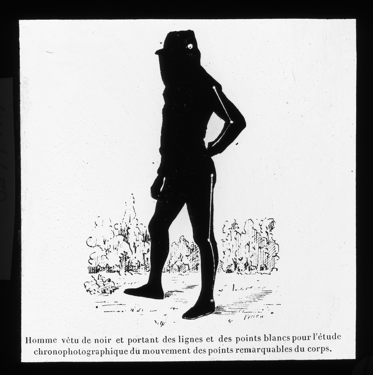 Man klädd i svart med vita prickar och linjer för att kunna studera kroppens rörelse i dessa punkter med hjälp av kronofotografi.