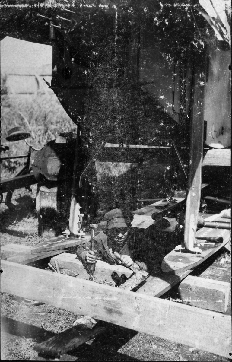 Fotografi ur album från Meisters-Flygaktiebolag i Göteborg. Liten pojke snickrar på flygplan.