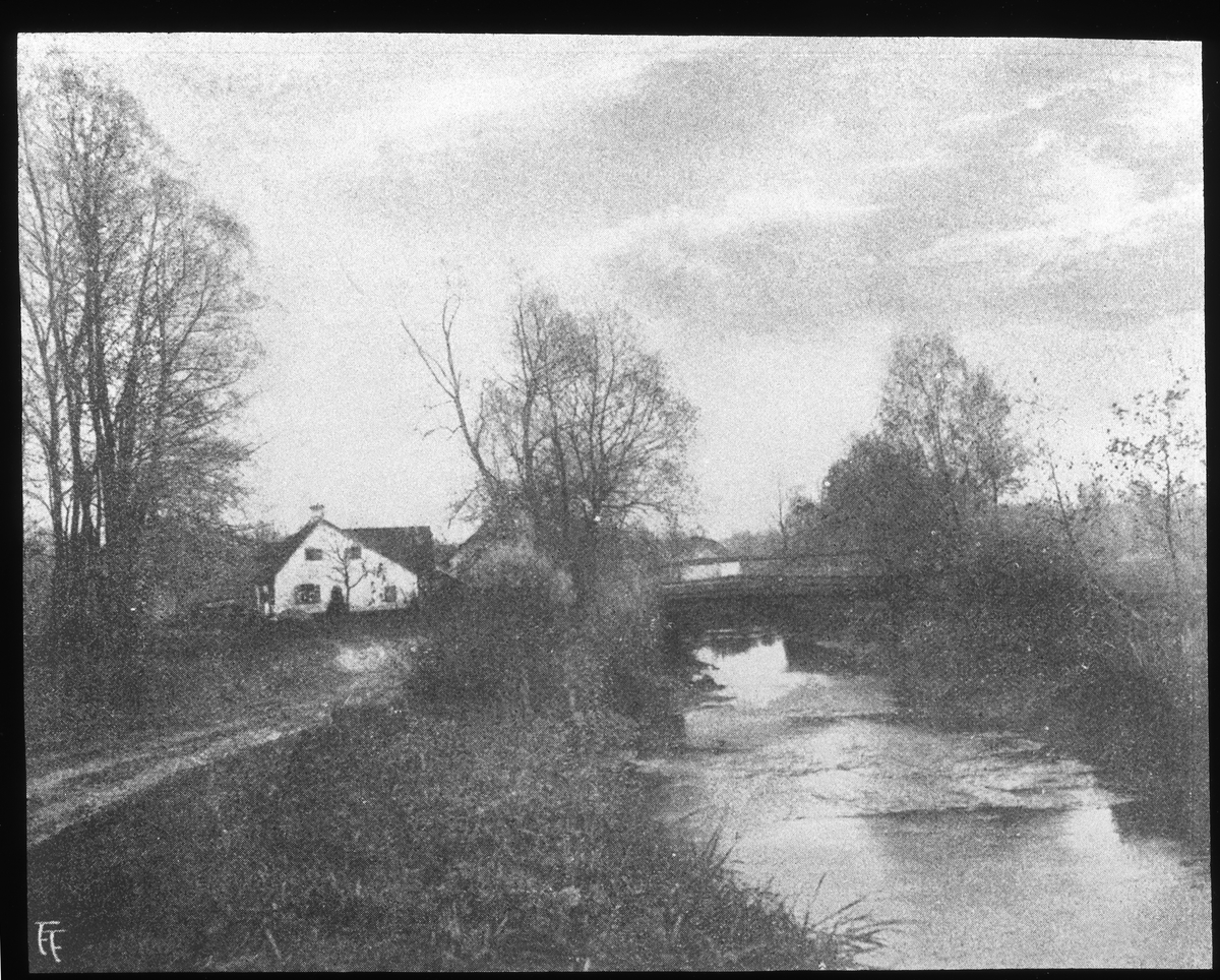 Skioptikonbild från institutionen för fotografi vid Kungliga Tekniska Högskolan. Använd av professor Helmer Bäckström som undervisningsmaterial. Bäckström var Sveriges förste professor i fotografi vid Kungliga Tekniska Högskolan 1948-1958. Landskapsbild. I bildens nedre vänstra hörn står skrivet FF. Bilden är en reproduktion.