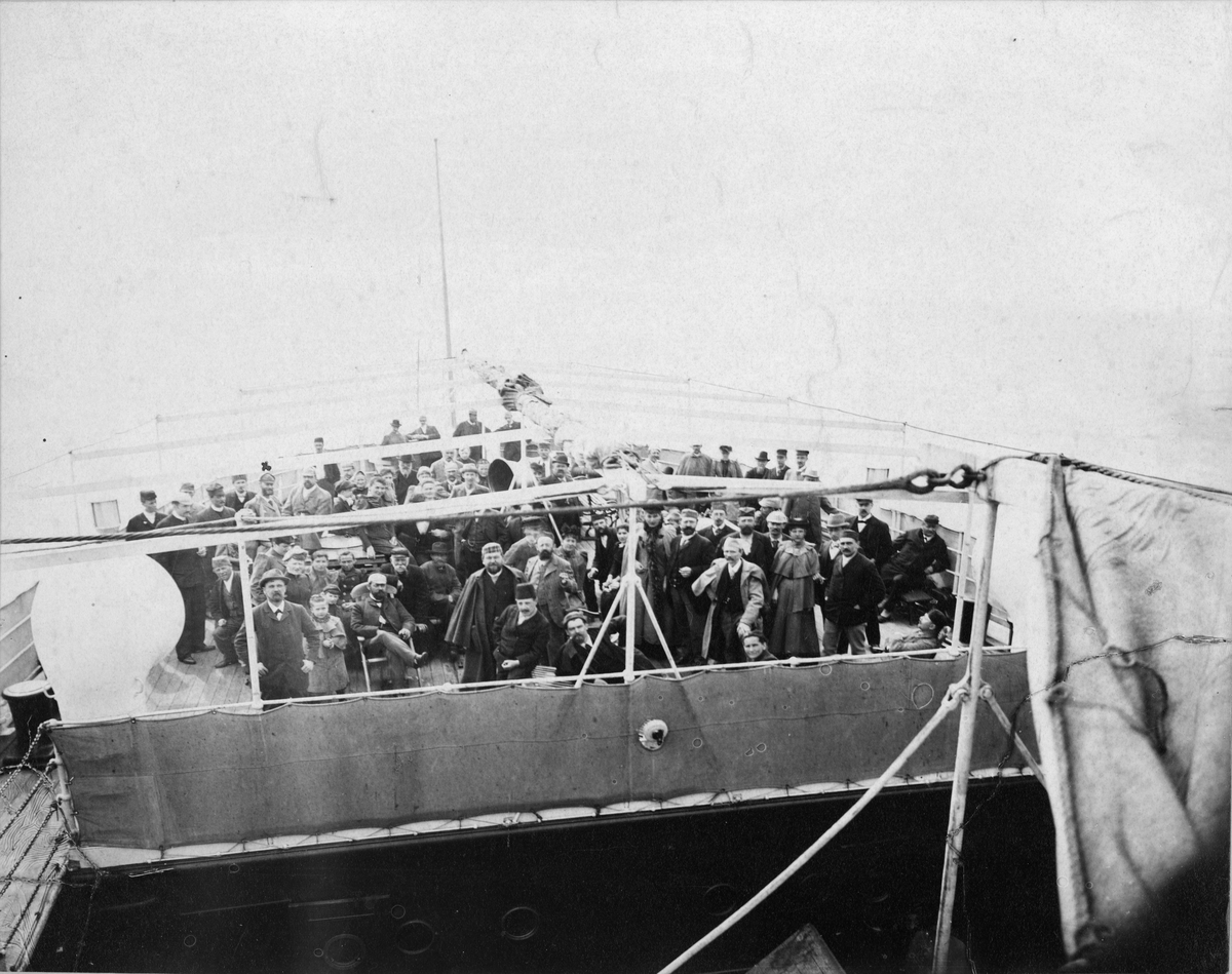 Passagerare på båt. Mannen med krysset över huvudet är R.W. Strehlenert. Troligen på 1880-talet.
