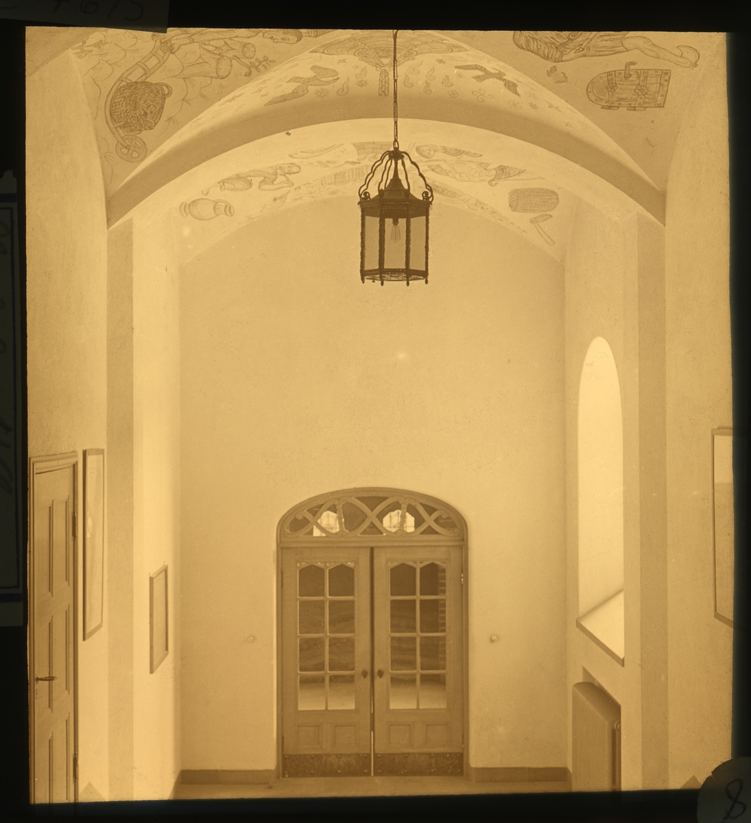 Skioptikonbild från institutionen för fotografi vid Kungliga Tekniska Högskolan. Använd av professor Helmer Bäckström som undervisningsmaterial. Bäckström var Sveriges förste professor i fotografi vid Kungliga Tekniska Högskolan 1948-1958. Trapphus. På bilden står skrivet: Na2 Sa2 O3 + HCl. För mer info: Se Fotografisk Handbok av Helmer Bäckström. Natur och Kultur. Andra omarbetade upplagan 1958-59. Kap 75-79 Toningsförfaranden för silverbilder (sid 585 och följande).