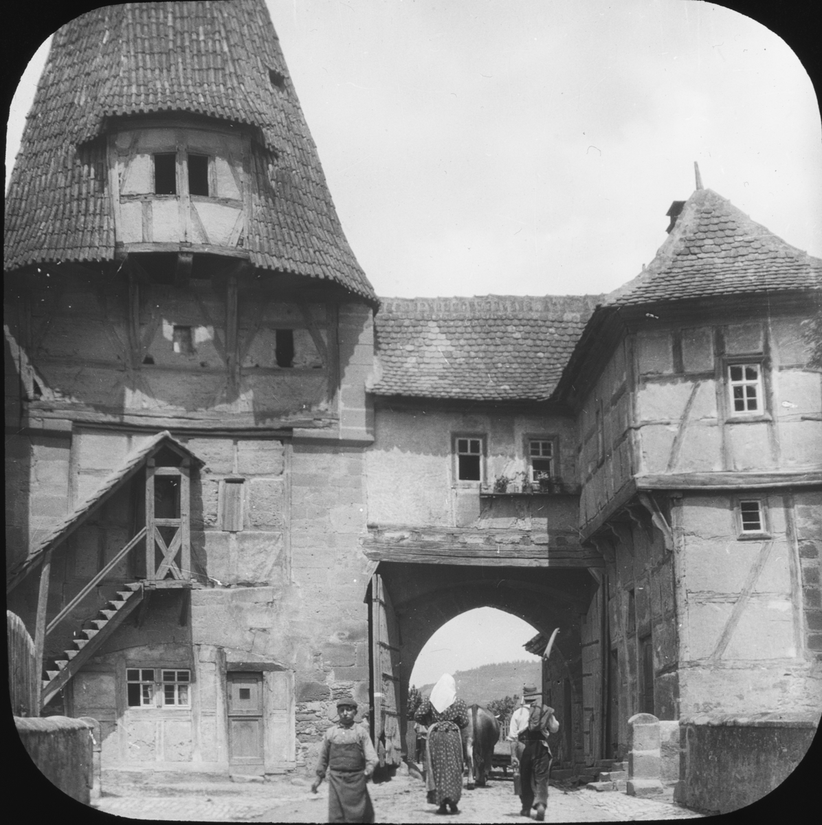 Skioptikonbild med motiv av stadsmursporten Rödelseer Tor, Iphofen.