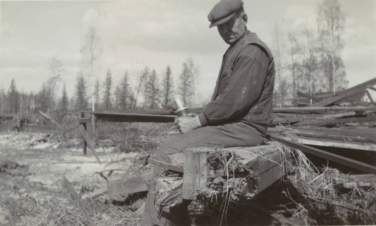Billsjön. Smeden Hammarström begrundar förödelsen efter översvämningen 1 maj 1936.