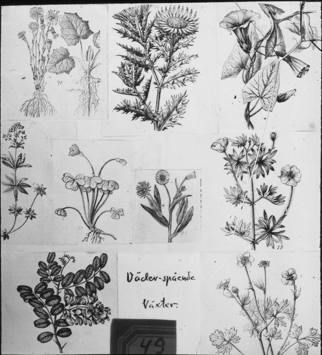 Skioptikonbild med motiv rörande olika typer av väderfenomen. Väderspående växter.