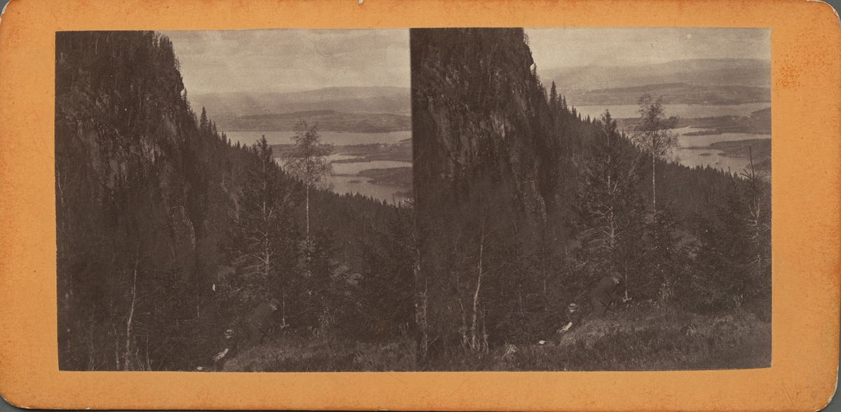 Stereobild med motiv två människor i bergslandsskap med blandskog, mest barrträd.