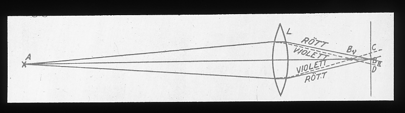En enkel lins ger olikabildpunkter för olika färger. Sålunda ligger bildpunkterna för violett (Bv) och blått närmare linsen än bildpunkterna för gult eller rött (Br).
