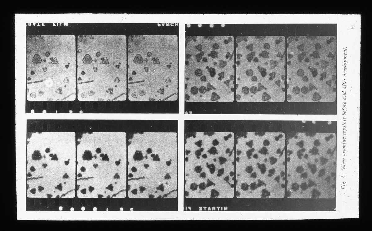 Mikrofotografi över silverbromidkristaller före och efter framkallning.
