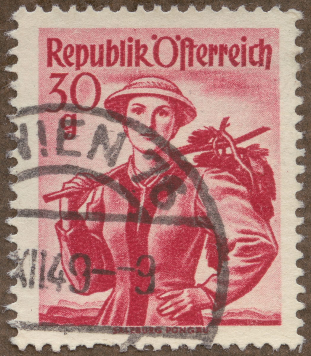 Frimärke från Österrike, 1948. Motiv av kvinnodräkt, Salzburg, Pongau.
