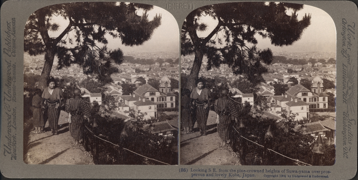 Stereobild från de trädbeklädda höjderna Suwa- yama, vy över staden Kobe, Japan.