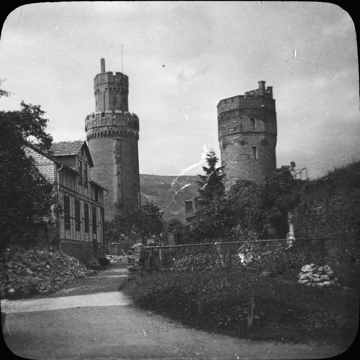 Skioptikonbild med motiv av torn vid slottet i Oberwesel.