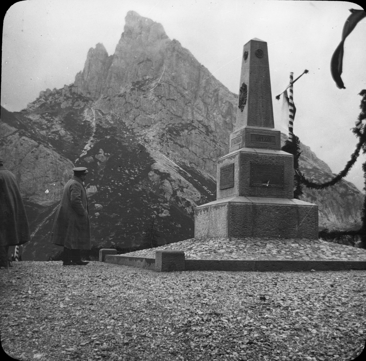Skioptikonbild med motiv av monumnentet vid av bergspasset Falzarego Pass mellan Andráz och Cortina d'Ampezzo.