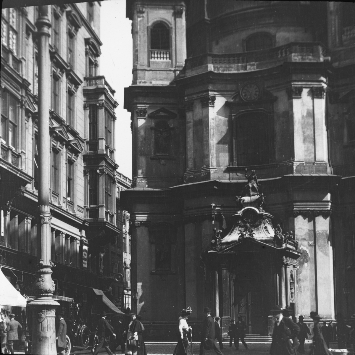Skioptikonbild med motiv av ingången till St. Peterskirche, Wien.