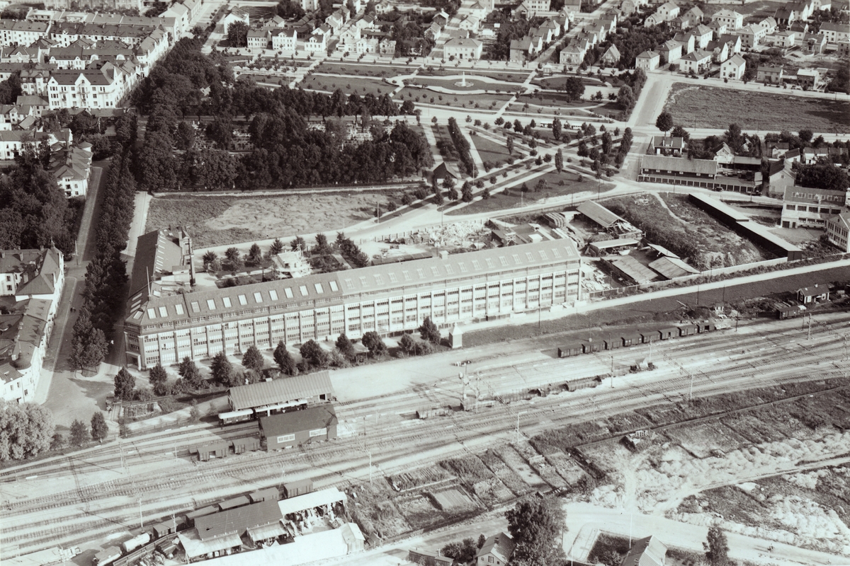 Flygfotografi över Oscaria skofabriker i Örebro.