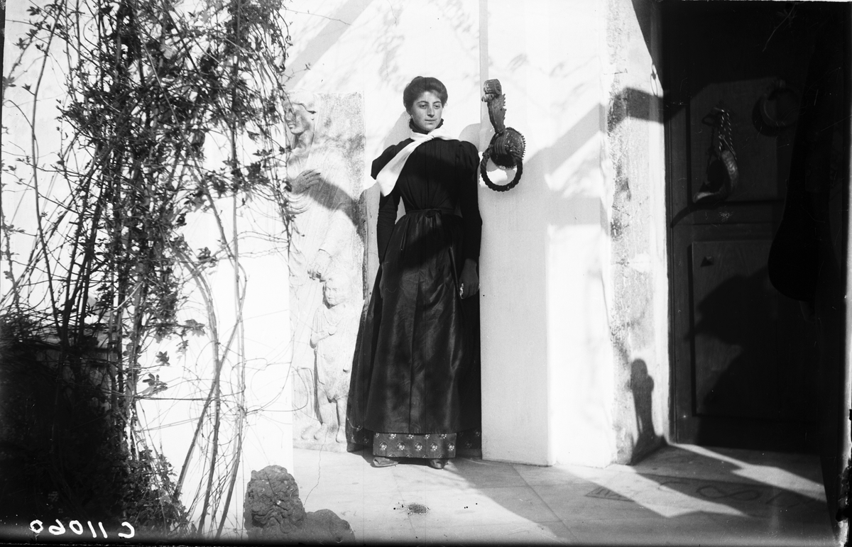 Drottning Victorias bilder. Kvinna invid port, kyrka?