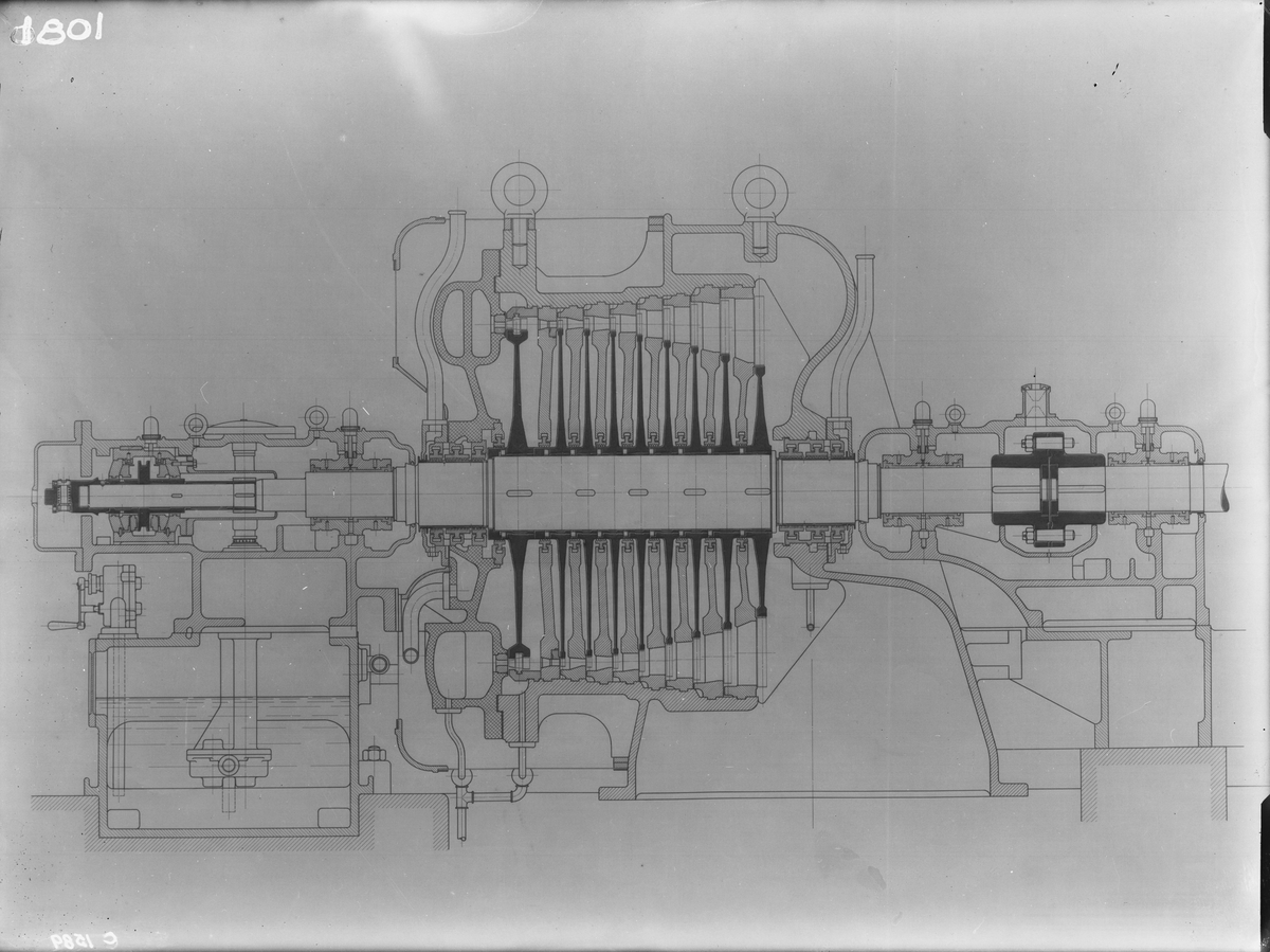 Titel: Ritning, snitt av turbin H9N. Bild tillhörande en samling glasnegativ med motiv från AB de Lavals Ångturbin.