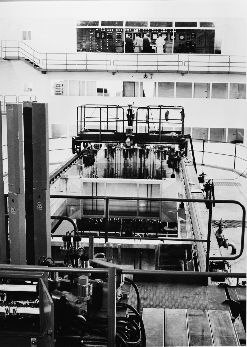 R2-reaktorn i Studsvik. Bassängen och kontrollrummet. Den 9 meter djupa bassängen, som är fylld med vatten, är delad i tre avdelningar. I den bortersta finns reaktorkärnan nedsänkt. Mittpartiet används för förvaring av viss materiel. I avdelningen närmast kameran har reaktor R2-0 placerats.