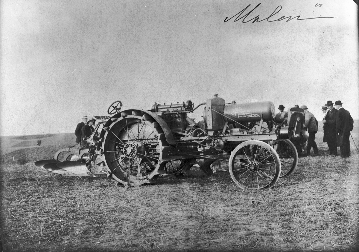 Motorplogstävling vid Hilleröd 1920. "Malcus" 24 Hkr Pentamotor.3 skärig.I sitt nuvarande skick är ej denna plog någon farlig konkurent.Den är mycket invecklad.Hela den långa vagnen är fullt upptagen av axlar, kugg- och kedjeväxlar, friktionskopplingar m.m.