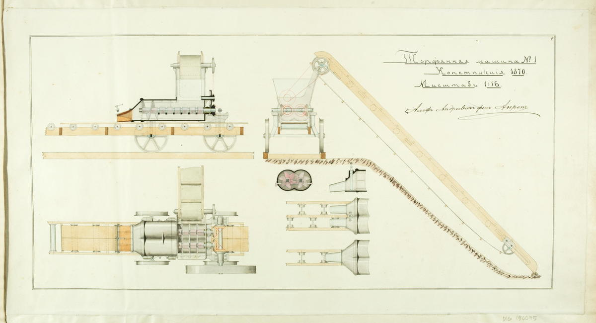 Skiss på ryska 1870, ur boken med ritningar mm 1868-1887, av den svenske torvmaskinkonstruktören Aleph Anrep.