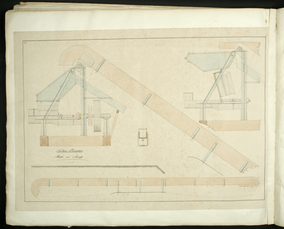 Liten elevator, Aleph von Anrep 1884 , ur boken med ritningar mm 1868-1887, av den svenske torvmaskinkonstruktören Aleph Anrep.