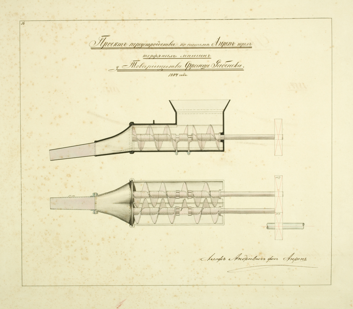 Rysk ritning 1884, ur boken med ritningar mm 1868-1887, av den svenske torvmaskinkonstruktören Aleph Anrep.