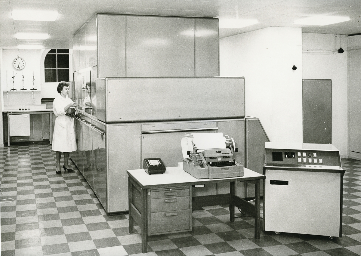 "Fig. 19. Prototypen till AutoChemist- världens största blodanalysanläggning (1965). Vid fronten den först använda datamaskinen, Eurocomps LGP 21, och en FlexoWriter utskriftsmaskin (1965)."