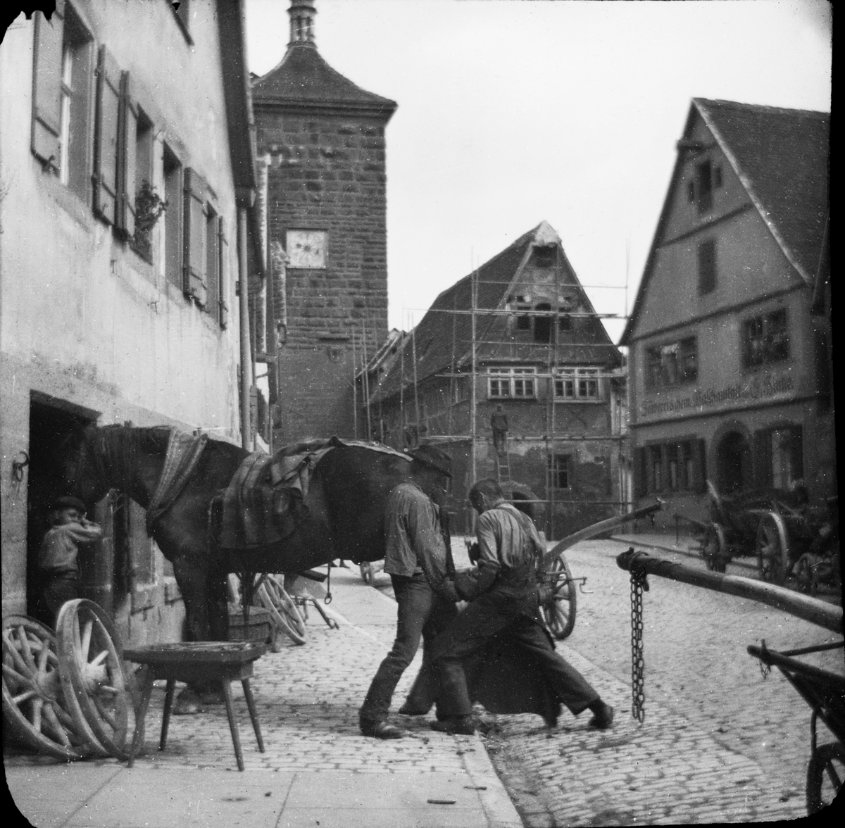 Skioptikonbild med motiv av hovslagare vid smedja i Rothenburg.