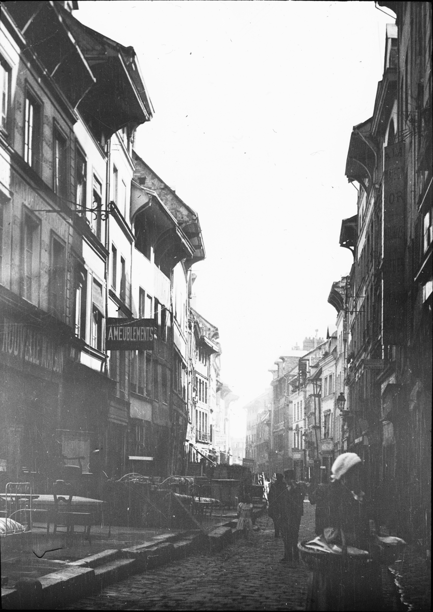 Skioptikonbild med motiv från handelsgata i Rouen.