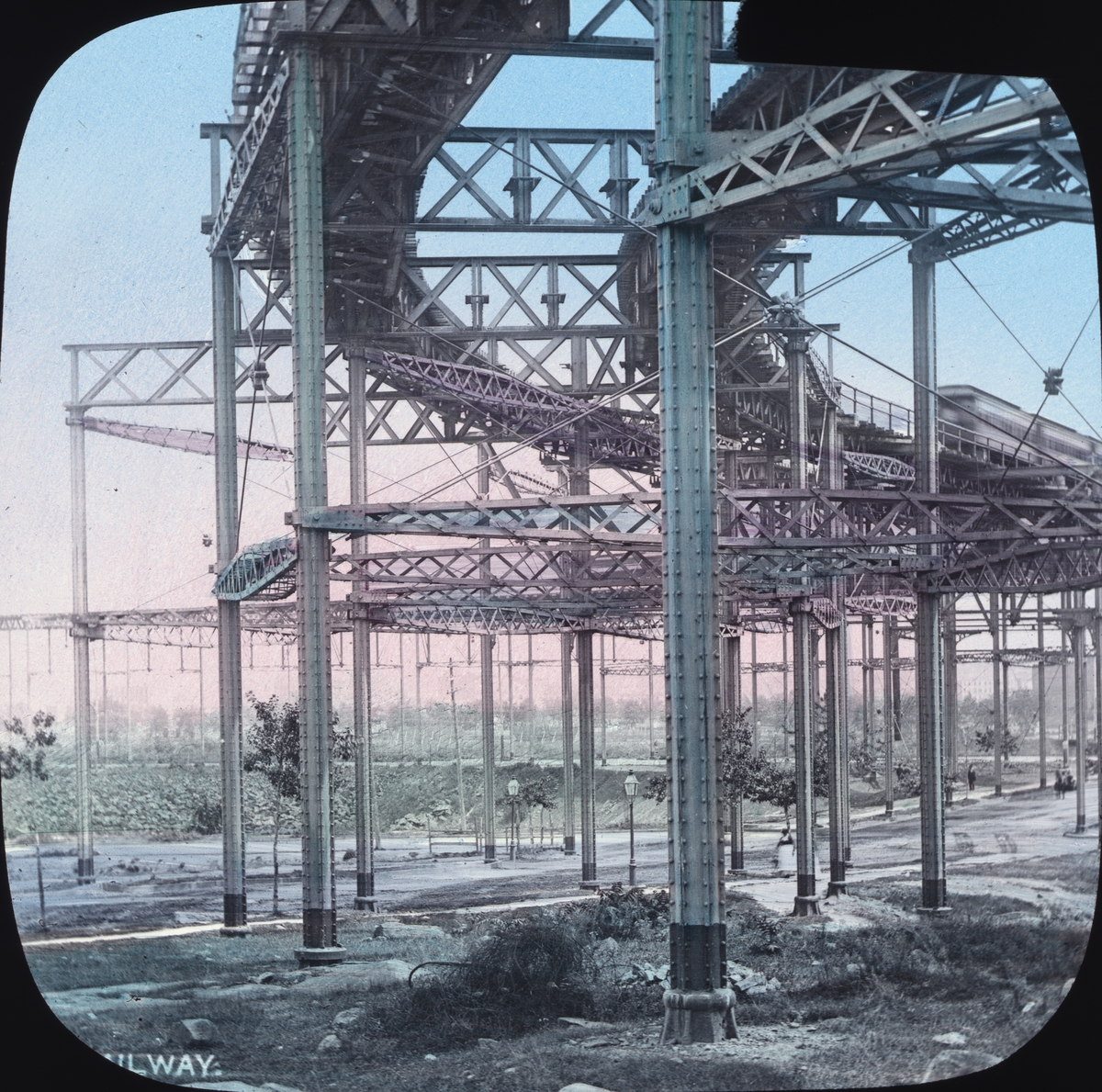 Kolorerad skioptikonbild med motiv av luftburen järnvägsräls. Möjligen The High Line i New York.