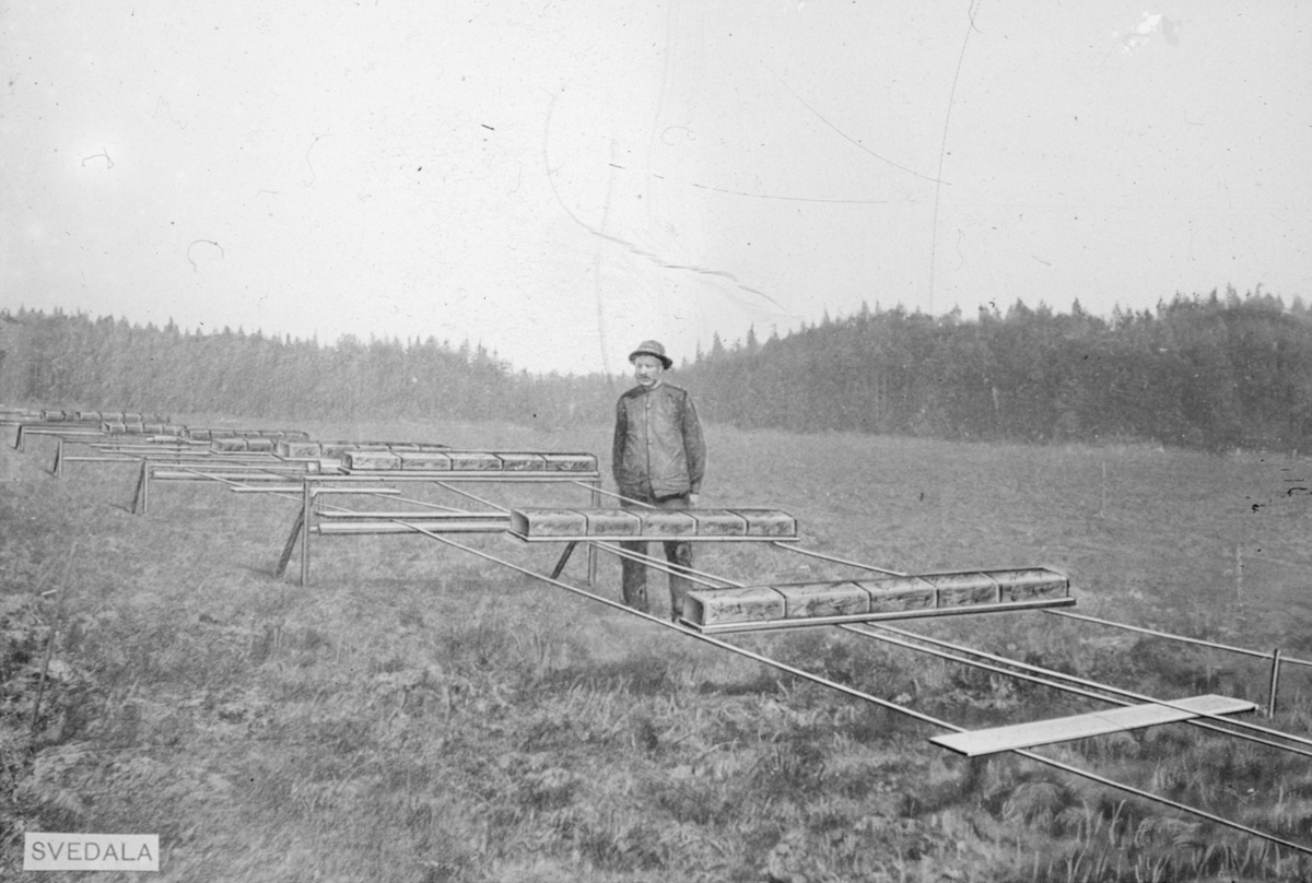 Skioptikonbild med motiv av torvbrytning på okänd mosse/ myr. Torvtransport.