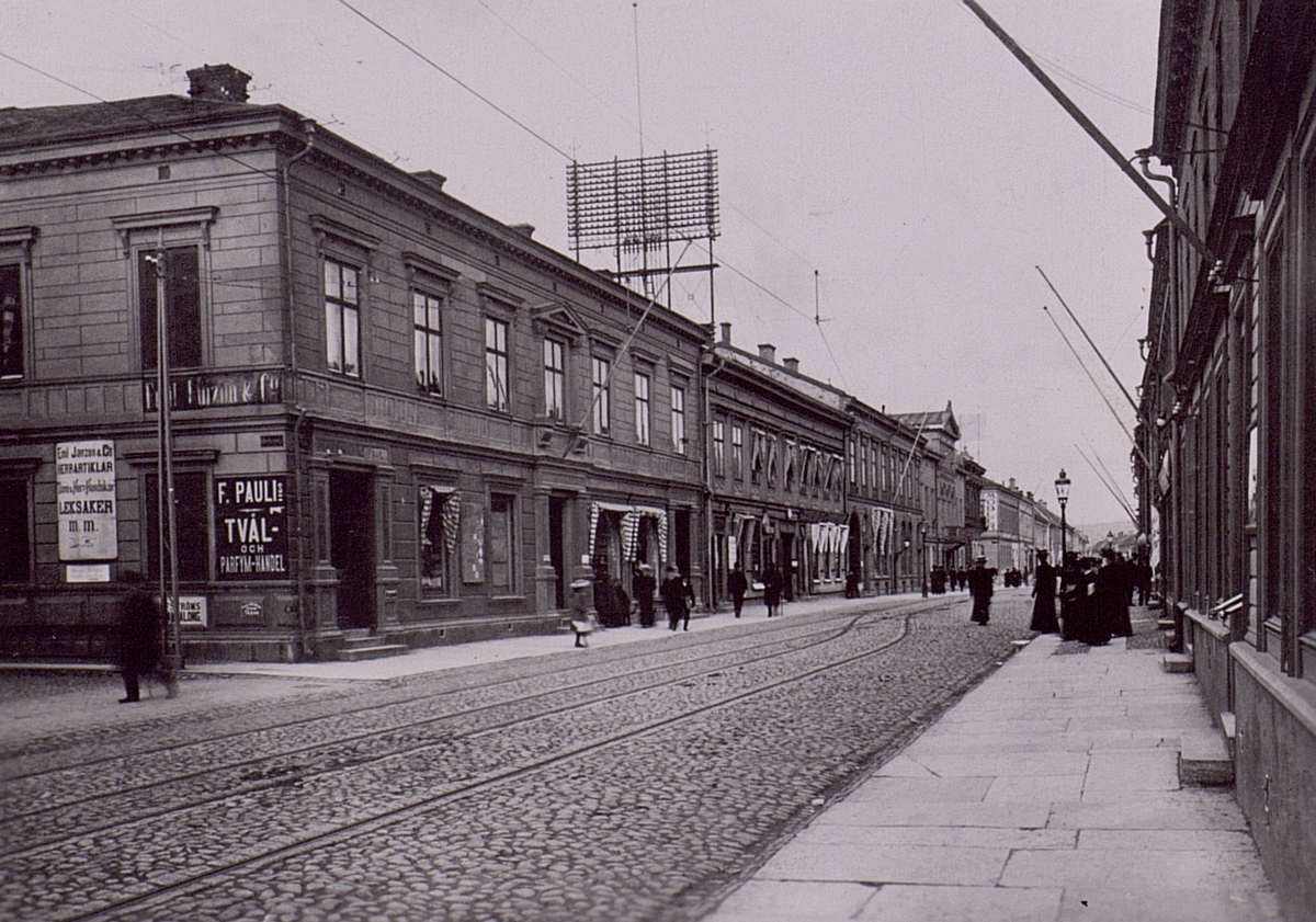Jönköpings telefonstation. Östra Storgatan 9 (fastigheten med takfästet). Stationen flyttade 1882 från gamla Rådhuset till Östra Storg. 25. Härifrån flyttades stationen 1892 till Östra Storg. 9, där den kvarblev till år 1909.