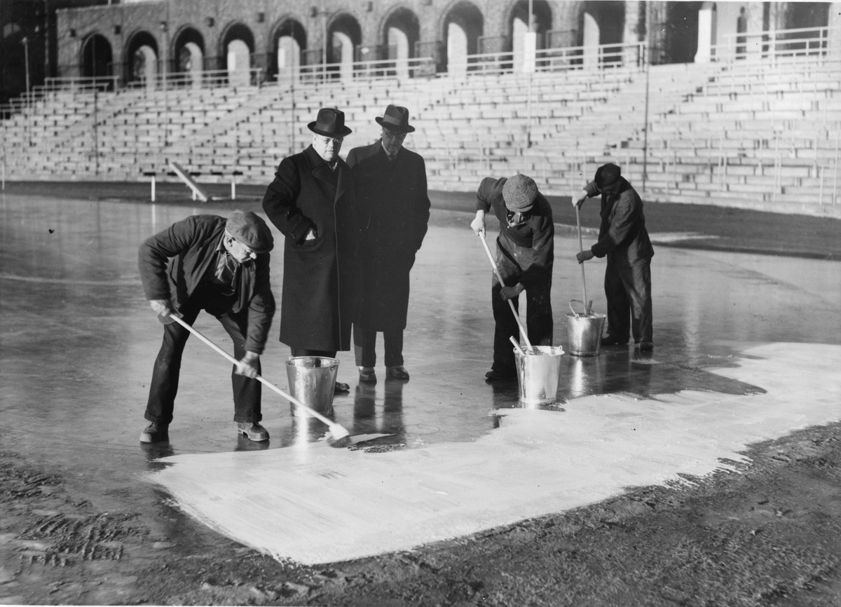 Tillverkning av skridskobanan på Stadion, Stockholm.