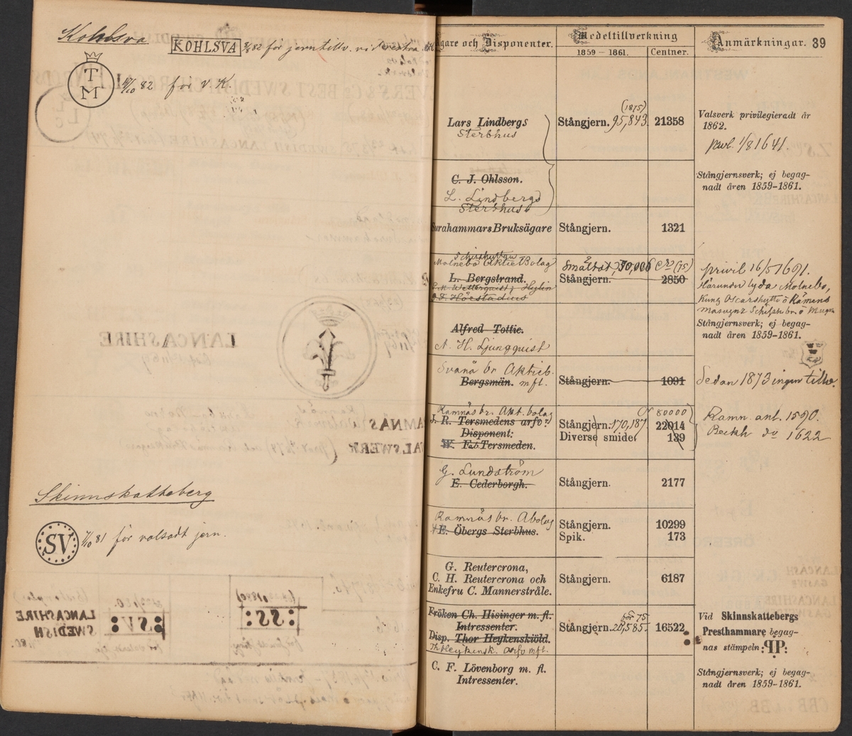 Titel: Stämpelbok för Svenska Järnverken 1864, med supplement 1867. Delvis handskrift. Ur Carl Sahlins bergshistoriska samling.