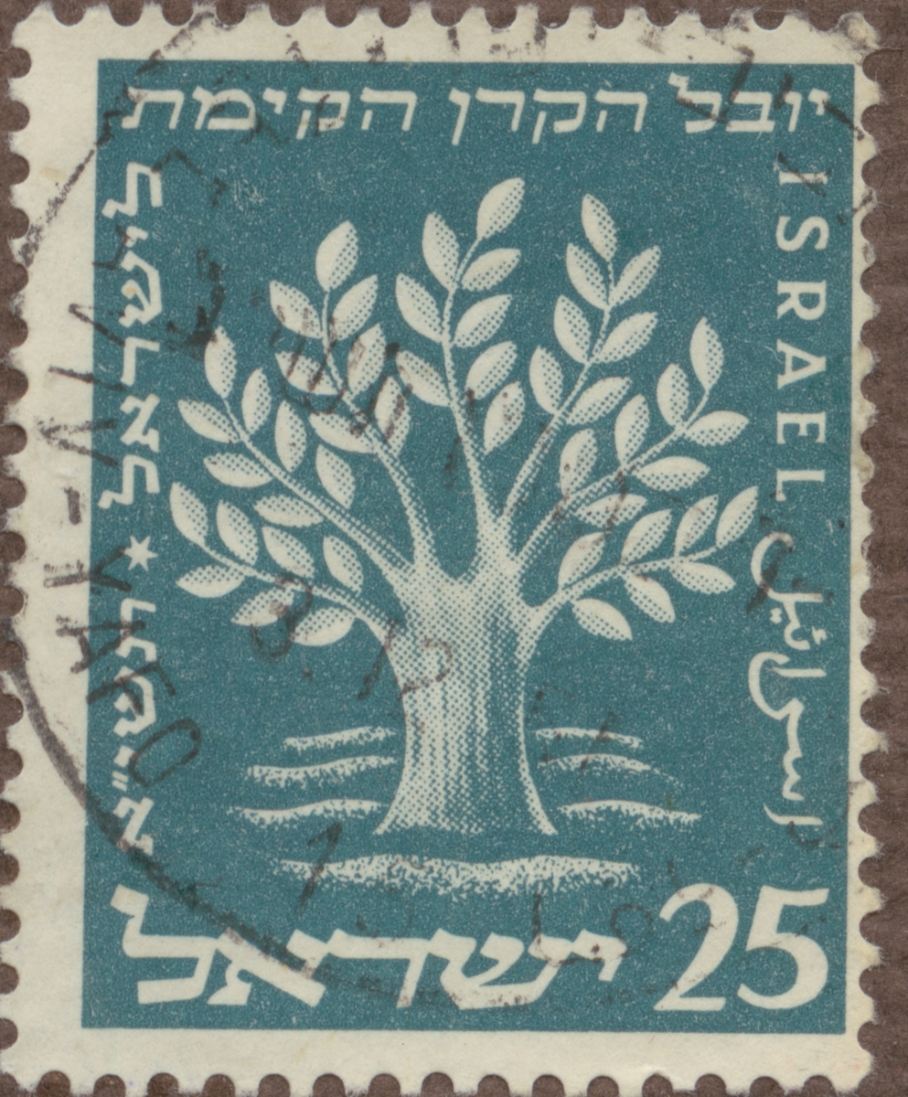 Frimärke från Israel, 1951. Motiv av gammal trästubbe med nya grenar. Symbol förnydaning. "Judiska National Fond 50 år 1901-1951.