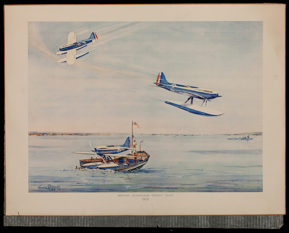 Plansch efter akvarell med motiv av glidflygplan. Brittska troféteamet för Schneider glidflygplan.