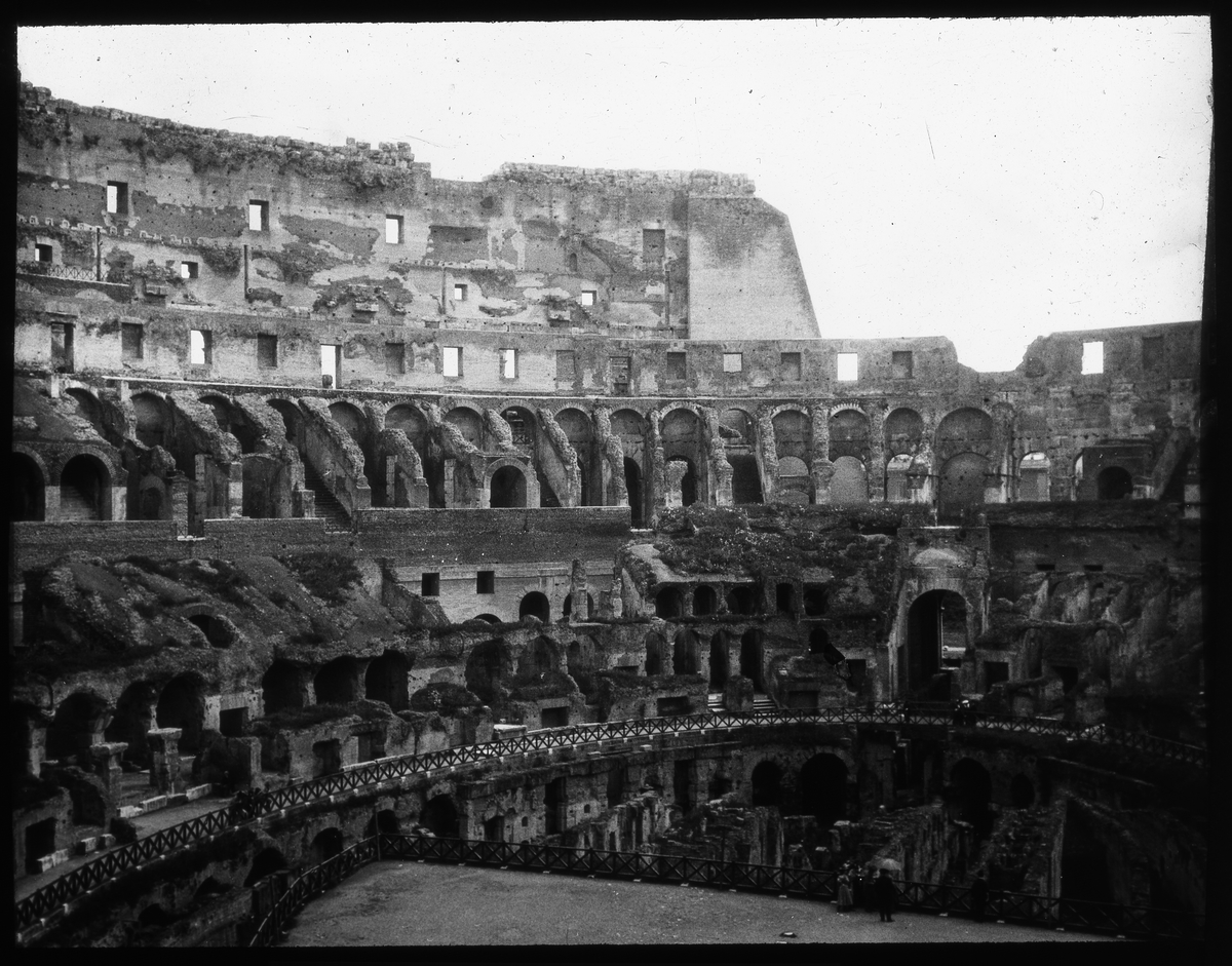 Skioptikonbild från institutionen för fotografi vid Kungliga Tekniska Högskolan. Motiv föreställande Colosseum i Rom (amfiteater som stod färdig år 80 e Kr.) Bilden är troligen tagen av John Hertzberg under en resa i Europa.