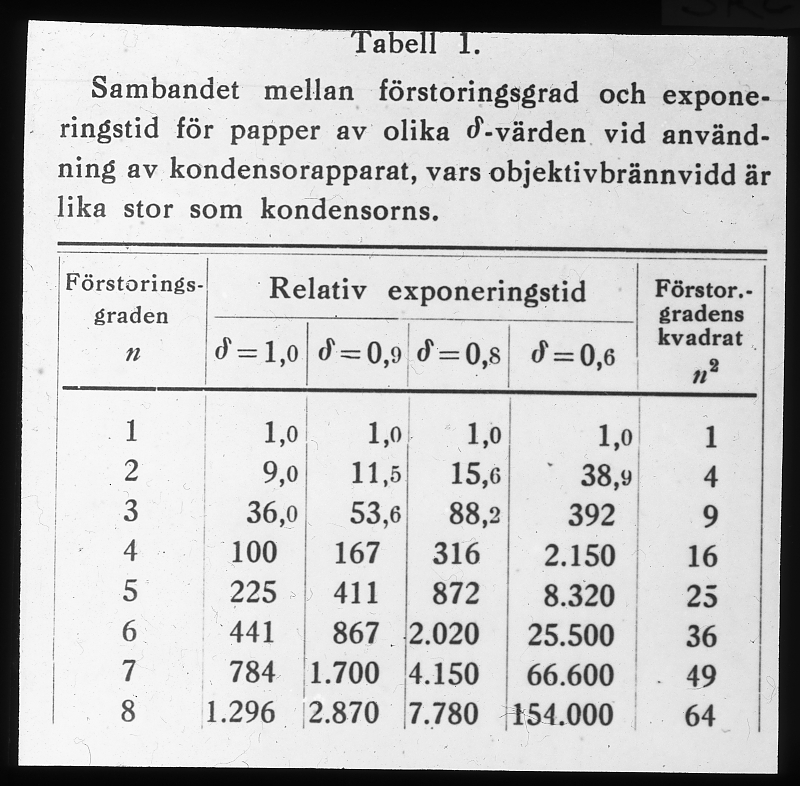 Skioptikonbild från institutionen för fotografi vid Kungliga Tekniska Högskolan. Använd av professor Helmer Bäckström som föreläsningsmaterial. Bäckström var Sveriges första professor i fotografi vid Kungliga Tekniska Högskolan 1948-58. Motiv föreställande "Sambandet mellan förstoringsgrad och exponeringstid för papper av olika värden (enligt Schwarldschildska exponenten) vid användande av kondensorapparat vars objektivbrännvidd är lika stor som kondensorn (för mer text se bilden). För mer info se: Bäckström, Helmer. fotografisk Handbok. Andra omarbetade upplagan. Natur och Kultur. Stockholm. 1948--59. s.. 649 under kapitel 85 Förstoringsteknik.