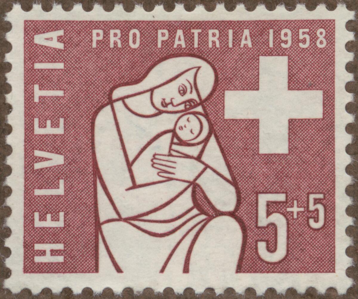 Frimärke från Schweiz, 1958. Motiv av Barnavård "Pro Patria Serien 1958"