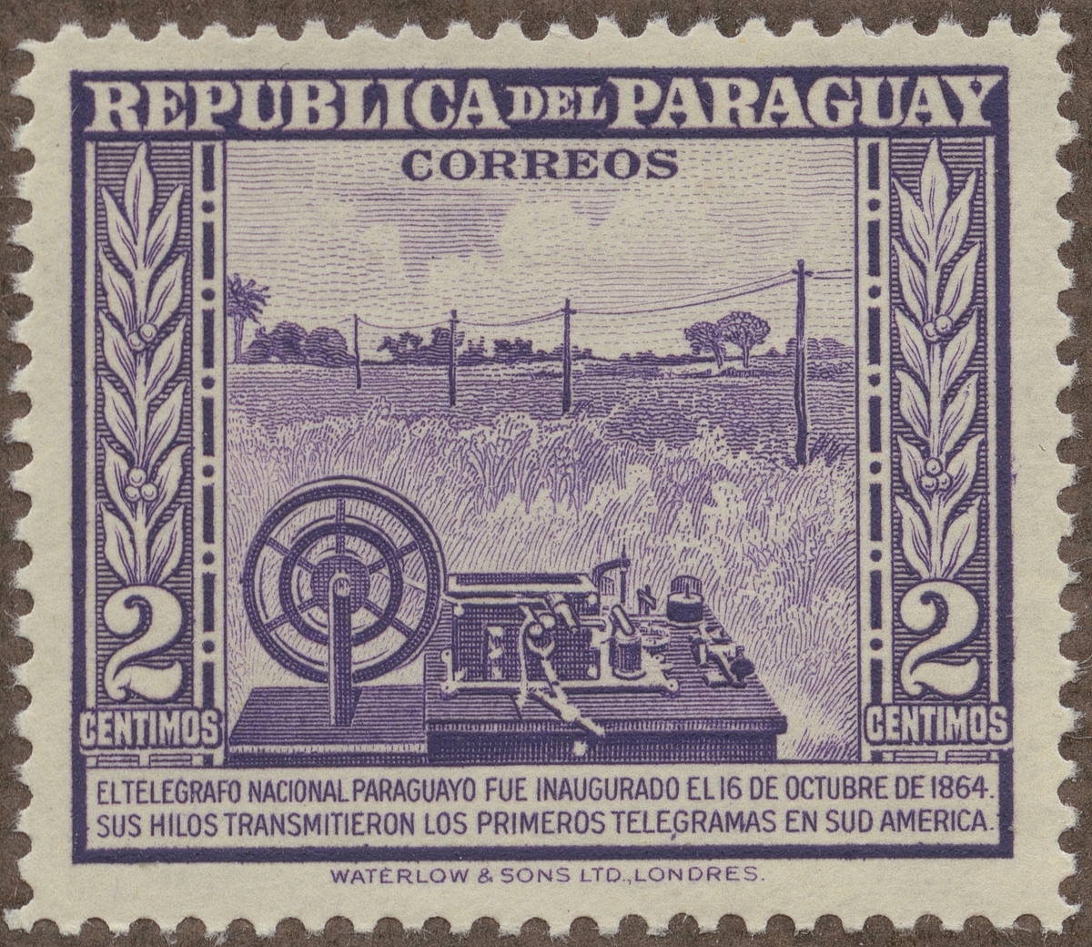 Frimärke ur Gösta Bodmans filatelistiska motivsamling, påbörjad 1950. Frimärke från Paraguay, 1946. Motiv av Den första telegrafen i Sydamerika. "Invigd i Paraguay d. 16 oktober 1864