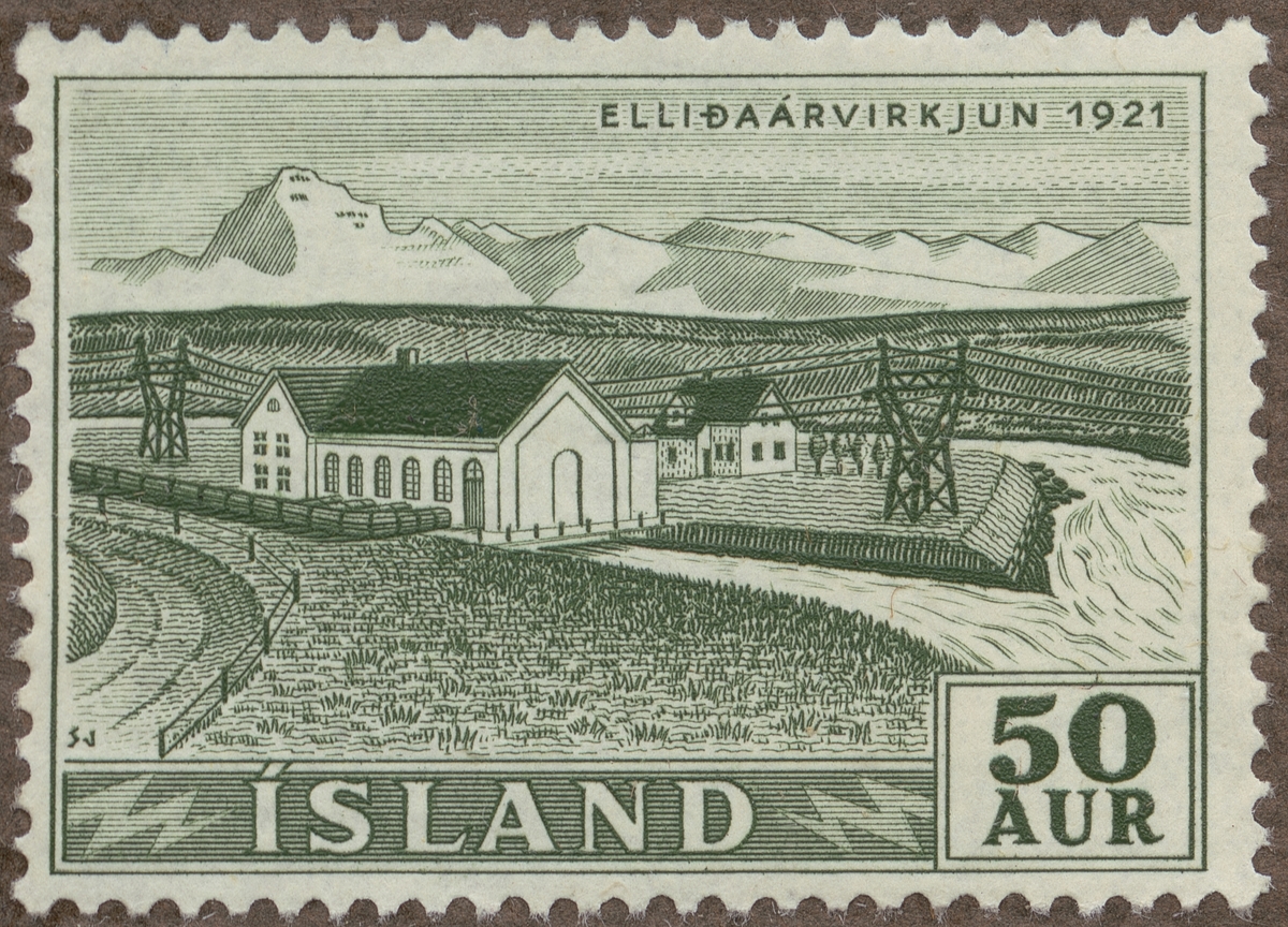 Frimärke ur Gösta Bodmans filatelistiska motivsamling, påbörjad 1950. Frimärke från Island, 1955. Motiv av Ellidaarrvirkjun 1921 El-kraftverk
